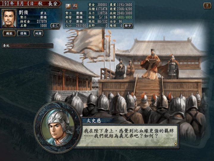 AI君主有的也懂权术平衡,如果你玩辅佐路线,可能会遇到被平调收权的局面。你好不容易混到了太守,辛辛苦苦把一座城养的兵多将广,结果一纸调令下来,你带着自己下属就得搬家去新的城,部队钱粮肯定是带不走,君主可能选几队给你“寄”过去。防止这类尴尬事件发生,只有两个办法,一个是太守上任后去官府把库房的钱财90%取出来变成私有,只留日常俸禄和任务所需,这样即便城池发生异常(调任、攻占、灾害)也不会影响,顺便还可以去“大商家”购买一些道具中饱私囊。另一个办法就是多打仗,让自己功勋快速增长,尽快升到二品成立军团,这样君主就不会发调令,最多从你军团内要个城或者几个武将。